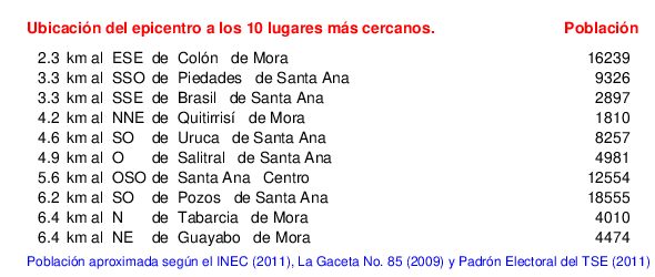 Mapa de la zona epicentral. Se muestran las poblaciones más cercanas al epicentro y fallas activas. Abajo están las distancias que hay del epicentro a cada uno de los diez sitios más cercanos y la cantidad de habitantes que poseen.