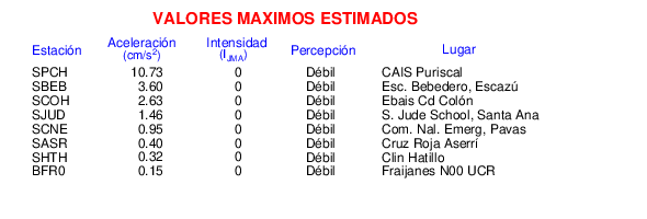 Intensidades en sitios de registro.Cada uno de los cuadrados en el mapa corresponde a la ubicación de un acelerógrafo al momento del sismo. Estos se muestran en distintos colores según la escala mostrada al pie de la figura.