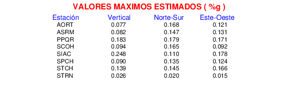 La siguiente tabla muestra los datos de aceleración máxima para cada componente en porcentaje de la aceleración de la gravedad (%g). Estos se obtienen dividiendo el valor del PGA registrado por 980 cm/s2 y multiplicándolo por 100.