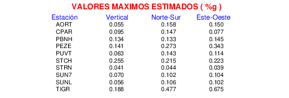 La siguiente tabla muestra los datos de aceleración máxima para cada componente en porcentaje de la aceleración de la gravedad (%g). Estos se obtienen dividiendo el valor del PGA registrado por 980 cm/s2 y multiplicándolo por 100.