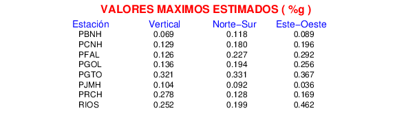 La siguiente tabla muestra los datos de aceleración máxima para cada componente en porcentaje de la aceleración de la gravedad (%g). Estos se obtienen dividiendo el valor del PGA registrado por 980 cm/s2 y multiplicándolo por 100.