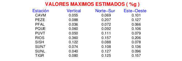 La siguiente tabla muestra los datos de aceleración máxima para cada componente en porcentaje de la aceleración de la gravedad (%g). Estos se obtienen dividiendo el valor del PGA registrado por 980 cm/s2 y multiplicándolo por 100.