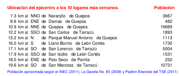 Mapa de la zona epicentral. Se muestran las poblaciones más cercanas al epicentro y fallas activas. Abajo están las distancias que hay del epicentro a cada uno de los diez sitios más cercanos y la cantidad de habitantes que poseen.