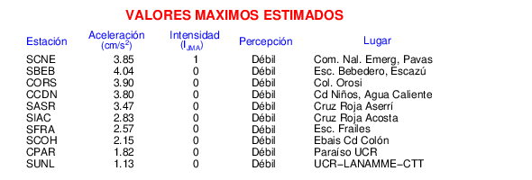 Intensidades en sitios de registro.Cada uno de los cuadrados en el mapa corresponde a la ubicación de un acelerógrafo al momento del sismo. Estos se muestran en distintos colores según la escala mostrada al pie de la figura.