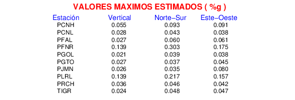 La siguiente tabla muestra los datos de aceleración máxima para cada componente en porcentaje de la aceleración de la gravedad (%g). Estos se obtienen dividiendo el valor del PGA registrado por 980 cm/s2 y multiplicándolo por 100.
