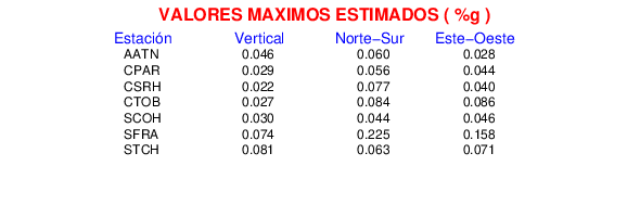 La siguiente tabla muestra los datos de aceleración máxima para cada componente en porcentaje de la aceleración de la gravedad (%g). Estos se obtienen dividiendo el valor del PGA registrado por 980 cm/s2 y multiplicándolo por 100.