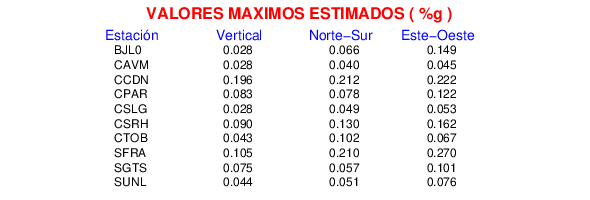 La siguiente tabla muestra los datos de aceleración máxima para cada componente en porcentaje de la aceleración de la gravedad (%g). Estos se obtienen dividiendo el valor del PGA registrado por 980 cm/s2 y multiplicándolo por 100.