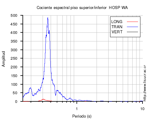 También se muestra el cociente espectral (en el rango de 0.1 a 10 s) entre el nivel superior (sea el último piso o la azotea) e inferior (sea el primero piso o el sótano) para cada una de las componentes LONG=longitudinal, TRAN=transversal y VERT=vertical. En los casos en que el nivel superior o inferior no estén disponibles al momento del sismo, se muestra una imagen con la leyenda "No se pudo calcular".