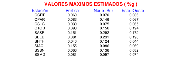 La siguiente tabla muestra los datos de aceleración máxima para cada componente en porcentaje de la aceleración de la gravedad (%g). Estos se obtienen dividiendo el valor del PGA registrado por 980 cm/s2 y multiplicándolo por 100.