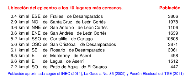 Mapa de la zona epicentral. Se muestran las poblaciones más cercanas al epicentro y fallas activas. Abajo están las distancias que hay del epicentro a cada uno de los diez sitios más cercanos y la cantidad de habitantes que poseen.