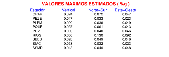 La siguiente tabla muestra los datos de aceleración máxima para cada componente en porcentaje de la aceleración de la gravedad (%g). Estos se obtienen dividiendo el valor del PGA registrado por 980 cm/s2 y multiplicándolo por 100.
