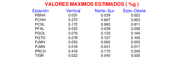 La siguiente tabla muestra los datos de aceleración máxima para cada componente en porcentaje de la aceleración de la gravedad (%g). Estos se obtienen dividiendo el valor del PGA registrado por 980 cm/s2 y multiplicándolo por 100.