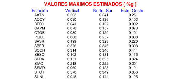 La siguiente tabla muestra los datos de aceleración máxima para cada componente en porcentaje de la aceleración de la gravedad (%g). Estos se obtienen dividiendo el valor del PGA registrado por 980 cm/s2 y multiplicándolo por 100.