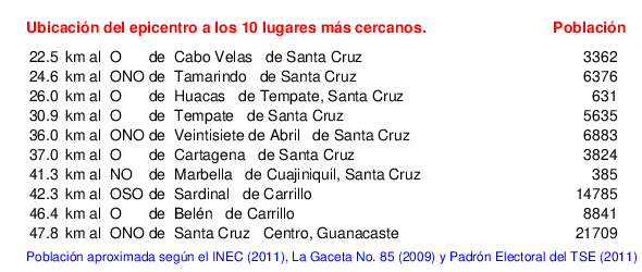 Mapa de la zona epicentral. Se muestran las poblaciones más cercanas al epicentro y fallas activas. Abajo están las distancias que hay del epicentro a cada uno de los diez sitios más cercanos y la cantidad de habitantes que poseen.