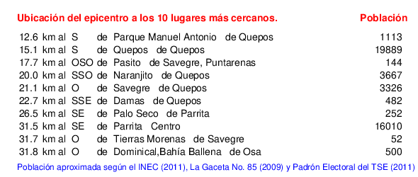Detalle de la zona epicentral:. Se muestran los poblados más cercanos al epicentro en un radio de unos 30 km. Las principales fallas activas son las trazas de color rojo. Abajo están las distancias que hay del epicentro a cada uno de los diez sitios más cercanos y la cantidad de habitantes que poseen.
