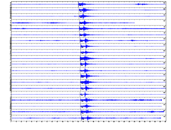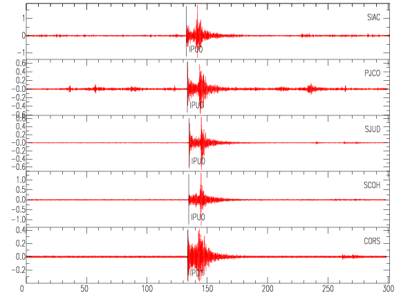 Mapa del epicentro: Los triángulos verdes son las estaciones acelerográficas usadas para calcular el epicentro que se muestra como un punto amarillo. El detalle de la magnitud y distancia a San José se muestra en el cuadro inserto en el mapa.