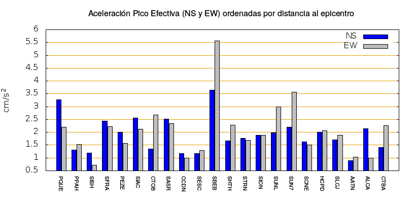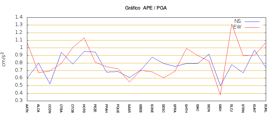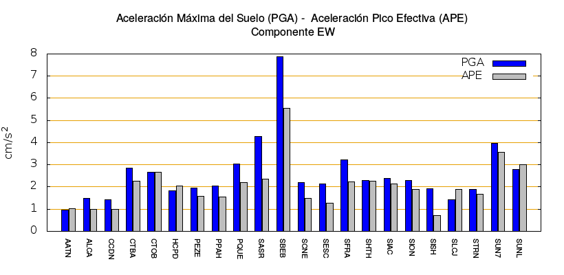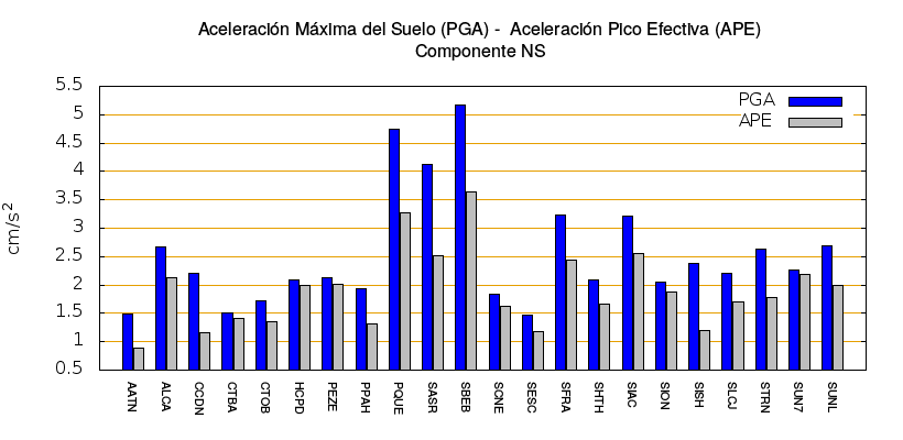 La siguiente tabla muestra los valores de aceleración efectiva para las componentes norte-sur (NS) y este-oeste (EW). También se muestra el valor del cociente entre la aceleración efectiva y la aceleración máxima (APE/PGA).
