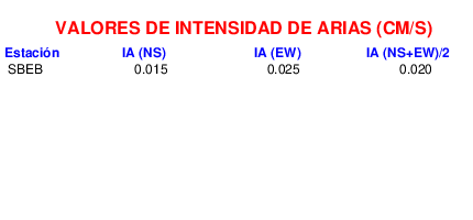 En esta sección se muestra el cáculo de la IA para la componente norte-sur (NS) y este-oeste (EW) de los registros de aceleración que tuvieron valores superiores a los 5 cm/s2, así como el valor total de esta que corresponde al promedio de ambas componentes horizontales.