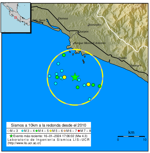 A 10km a la redonda del epicentro, el LISUCR ha localizado también los siguientes sismos ocurridos desde el 2010. Todos ellos con profundidades inferiores a los 40km.