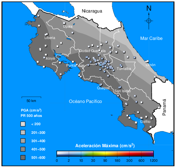 El siguiente es el mapa de amenaza sísmica para un período de retorno de 500 años. Cada cuadro es una estación acelerográfica coloreada según el valor de aceleración máxima registrado. Para este sismo el máximo fue de 7.9 gal o cm/s2.