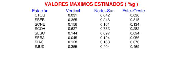 La siguiente tabla muestra los datos de aceleración máxima para cada componente en porcentaje de la aceleración de la gravedad (%g). Estos se obtienen dividiendo el valor del PGA registrado por 980 cm/s2 y multiplicándolo por 100.