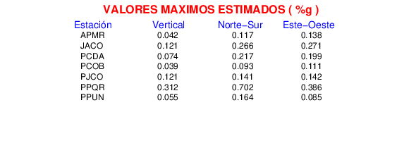 La siguiente tabla muestra los datos de aceleración máxima para cada componente en porcentaje de la aceleración de la gravedad (%g). Estos se obtienen dividiendo el valor del PGA registrado por 980 cm/s2 y multiplicándolo por 100.