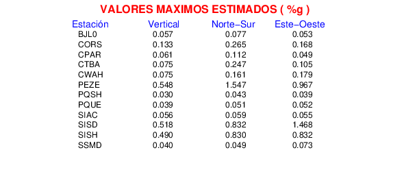 La siguiente tabla muestra los datos de aceleración máxima para cada componente en porcentaje de la aceleración de la gravedad (%g). Estos se obtienen dividiendo el valor del PGA registrado por 980 cm/s2 y multiplicándolo por 100.
