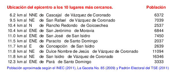 Mapa de la zona epicentral. Se muestran las poblaciones más cercanas al epicentro y fallas activas. Abajo están las distancias que hay del epicentro a cada uno de los diez sitios más cercanos y la cantidad de habitantes que poseen.