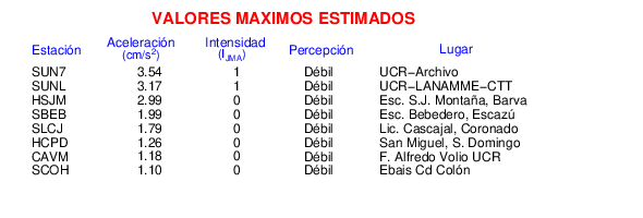 Intensidades en sitios de registro.Cada uno de los cuadrados en el mapa corresponde a la ubicación de un acelerógrafo al momento del sismo. Estos se muestran en distintos colores según la escala mostrada al pie de la figura.