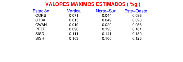 La siguiente tabla muestra los datos de aceleración máxima para cada componente en porcentaje de la aceleración de la gravedad (%g). Estos se obtienen dividiendo el valor del PGA registrado por 980 cm/s2 y multiplicándolo por 100.