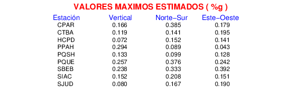 La siguiente tabla muestra los datos de aceleración máxima para cada componente en porcentaje de la aceleración de la gravedad (%g). Estos se obtienen dividiendo el valor del PGA registrado por 980 cm/s2 y multiplicándolo por 100.