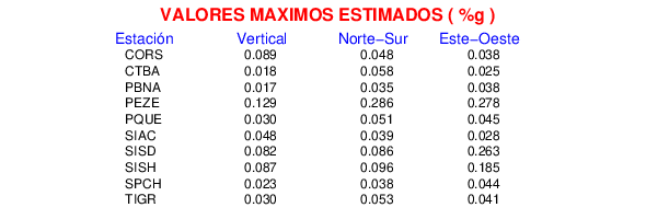 La siguiente tabla muestra los datos de aceleración máxima para cada componente en porcentaje de la aceleración de la gravedad (%g). Estos se obtienen dividiendo el valor del PGA registrado por 980 cm/s2 y multiplicándolo por 100.