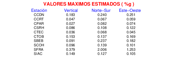 La siguiente tabla muestra los datos de aceleración máxima para cada componente en porcentaje de la aceleración de la gravedad (%g). Estos se obtienen dividiendo el valor del PGA registrado por 980 cm/s2 y multiplicándolo por 100.