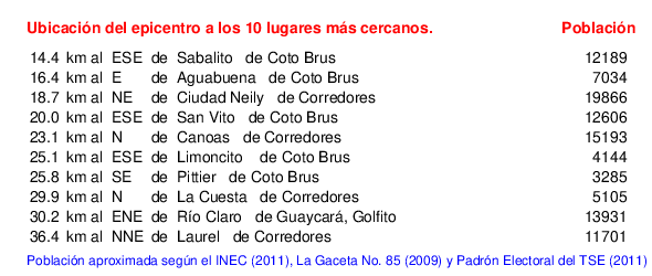 Mapa de la zona epicentral. Se muestran las poblaciones más cercanas al epicentro y fallas activas. Abajo están las distancias que hay del epicentro a cada uno de los diez sitios más cercanos y la cantidad de habitantes que poseen.
