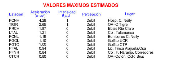 Intensidades en sitios de registro.Cada uno de los cuadrados en el mapa corresponde a la ubicación de un acelerógrafo al momento del sismo. Estos se muestran en distintos colores según la escala mostrada al pie de la figura.