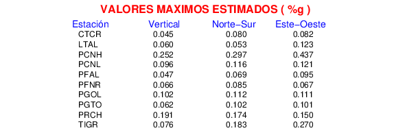 La siguiente tabla muestra los datos de aceleración máxima para cada componente en porcentaje de la aceleración de la gravedad (%g). Estos se obtienen dividiendo el valor del PGA registrado por 980 cm/s2 y multiplicándolo por 100.