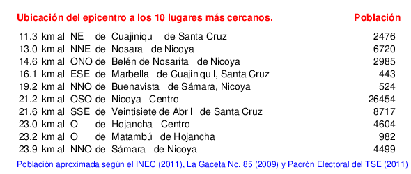 Mapa de la zona epicentral. Se muestran las poblaciones más cercanas al epicentro y fallas activas. Abajo están las distancias que hay del epicentro a cada uno de los diez sitios más cercanos y la cantidad de habitantes que poseen.