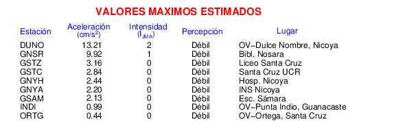 Intensidades en sitios de registro.Cada uno de los cuadrados en el mapa corresponde a la ubicación de un acelerógrafo al momento del sismo. Estos se muestran en distintos colores según la escala mostrada al pie de la figura.