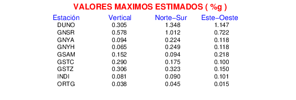 La siguiente tabla muestra los datos de aceleración máxima para cada componente en porcentaje de la aceleración de la gravedad (%g). Estos se obtienen dividiendo el valor del PGA registrado por 980 cm/s2 y multiplicándolo por 100.