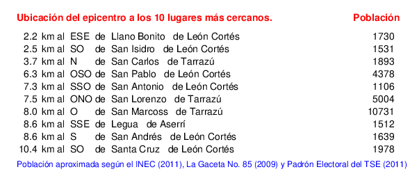 Detalle de la zona epicentral:. Se muestran los poblados más cercanos al epicentro en un radio de unos 30 km. Las principales fallas activas son las trazas de color rojo. Abajo están las distancias que hay del epicentro a cada uno de los diez sitios más cercanos y la cantidad de habitantes que poseen.