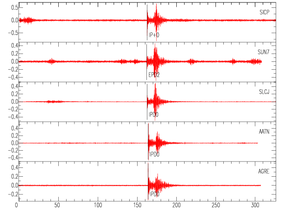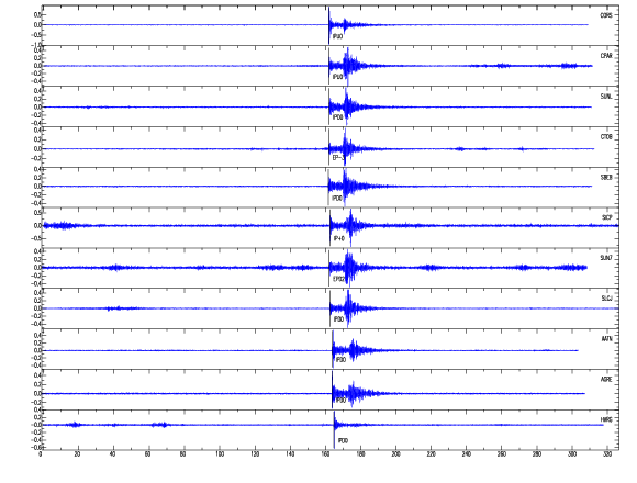 Mapa del epicentro: Los triángulos verdes son las estaciones acelerográficas usadas para calcular el epicentro que se muestra como un punto amarillo. El detalle de la magnitud y distancia a San José se muestra en el cuadro inserto en el mapa.