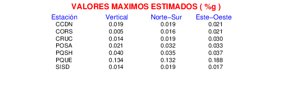 La siguiente tabla muestra los datos de aceleración máxima para cada componente en porcentaje de la aceleración de la gravedad (%g). Estos se obtienen dividiendo el valor del PGA registrado por 980 cm/s2 y multiplicándolo por 100.