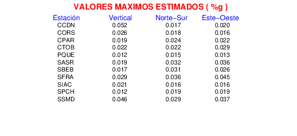 La siguiente tabla muestra los datos de aceleración máxima para cada componente en porcentaje de la aceleración de la gravedad (%g). Estos se obtienen dividiendo el valor del PGA registrado por 980 cm/s2 y multiplicándolo por 100.