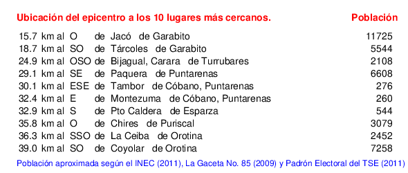 Mapa de la zona epicentral. Se muestran las poblaciones más cercanas al epicentro y fallas activas. Abajo están las distancias que hay del epicentro a cada uno de los diez sitios más cercanos y la cantidad de habitantes que poseen.