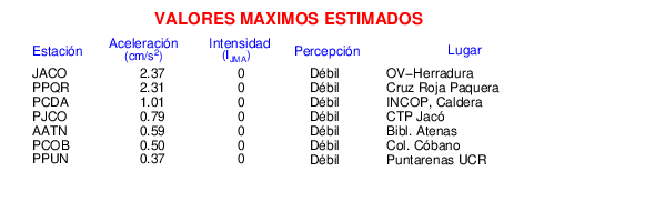 Intensidades en sitios de registro.Cada uno de los cuadrados en el mapa corresponde a la ubicación de un acelerógrafo al momento del sismo. Estos se muestran en distintos colores según la escala mostrada al pie de la figura.