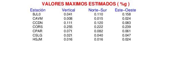 La siguiente tabla muestra los datos de aceleración máxima para cada componente en porcentaje de la aceleración de la gravedad (%g). Estos se obtienen dividiendo el valor del PGA registrado por 980 cm/s2 y multiplicándolo por 100.