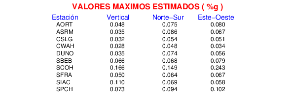 La siguiente tabla muestra los datos de aceleración máxima para cada componente en porcentaje de la aceleración de la gravedad (%g). Estos se obtienen dividiendo el valor del PGA registrado por 980 cm/s2 y multiplicándolo por 100.