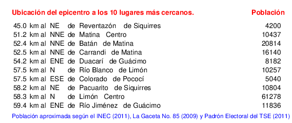 Mapa de la zona epicentral. Se muestran las poblaciones más cercanas al epicentro y fallas activas. Abajo están las distancias que hay del epicentro a cada uno de los diez sitios más cercanos y la cantidad de habitantes que poseen.