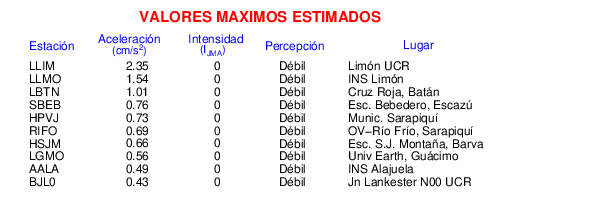 Intensidades en sitios de registro.Cada uno de los cuadrados en el mapa corresponde a la ubicación de un acelerógrafo al momento del sismo. Estos se muestran en distintos colores según la escala mostrada al pie de la figura.