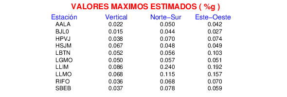 La siguiente tabla muestra los datos de aceleración máxima para cada componente en porcentaje de la aceleración de la gravedad (%g). Estos se obtienen dividiendo el valor del PGA registrado por 980 cm/s2 y multiplicándolo por 100.